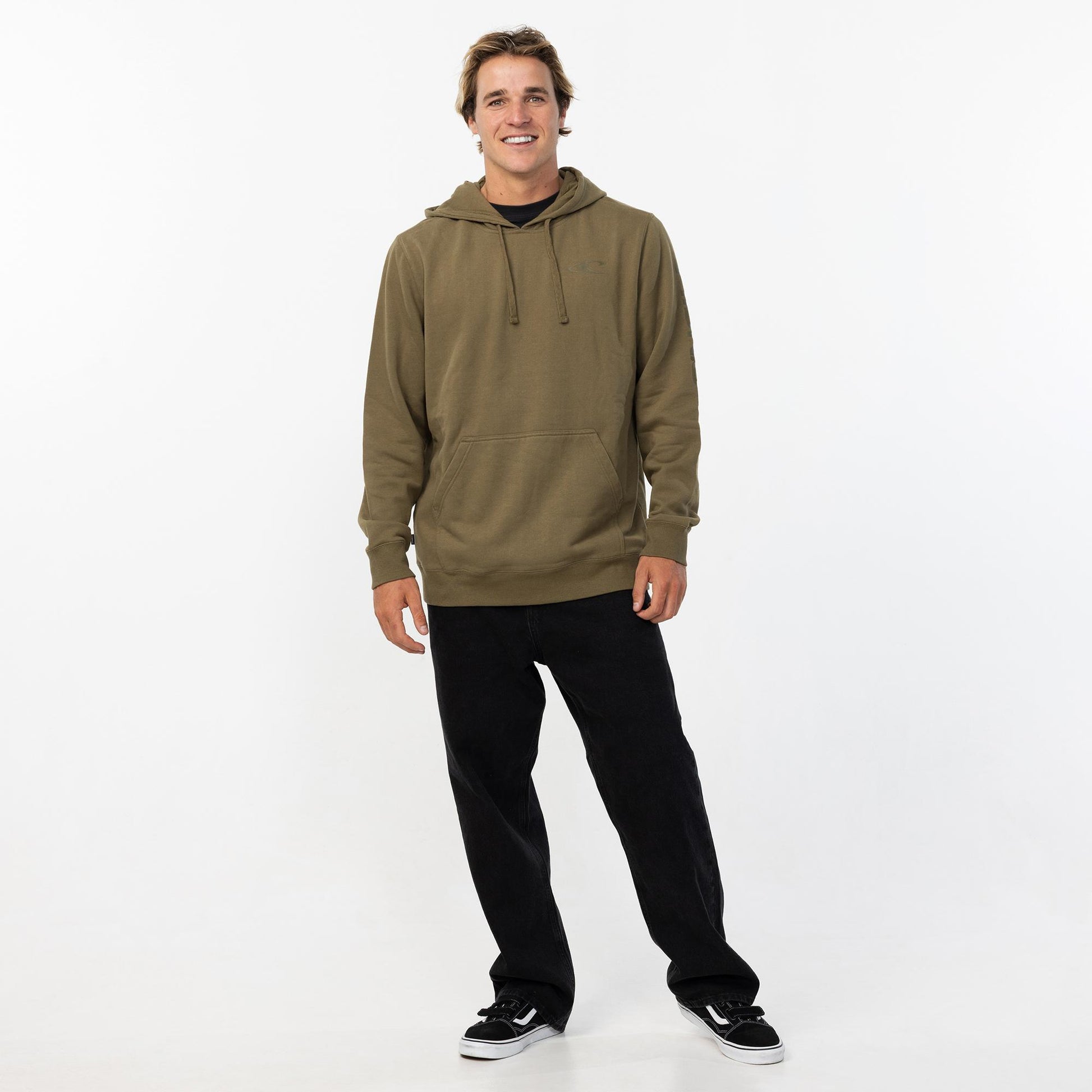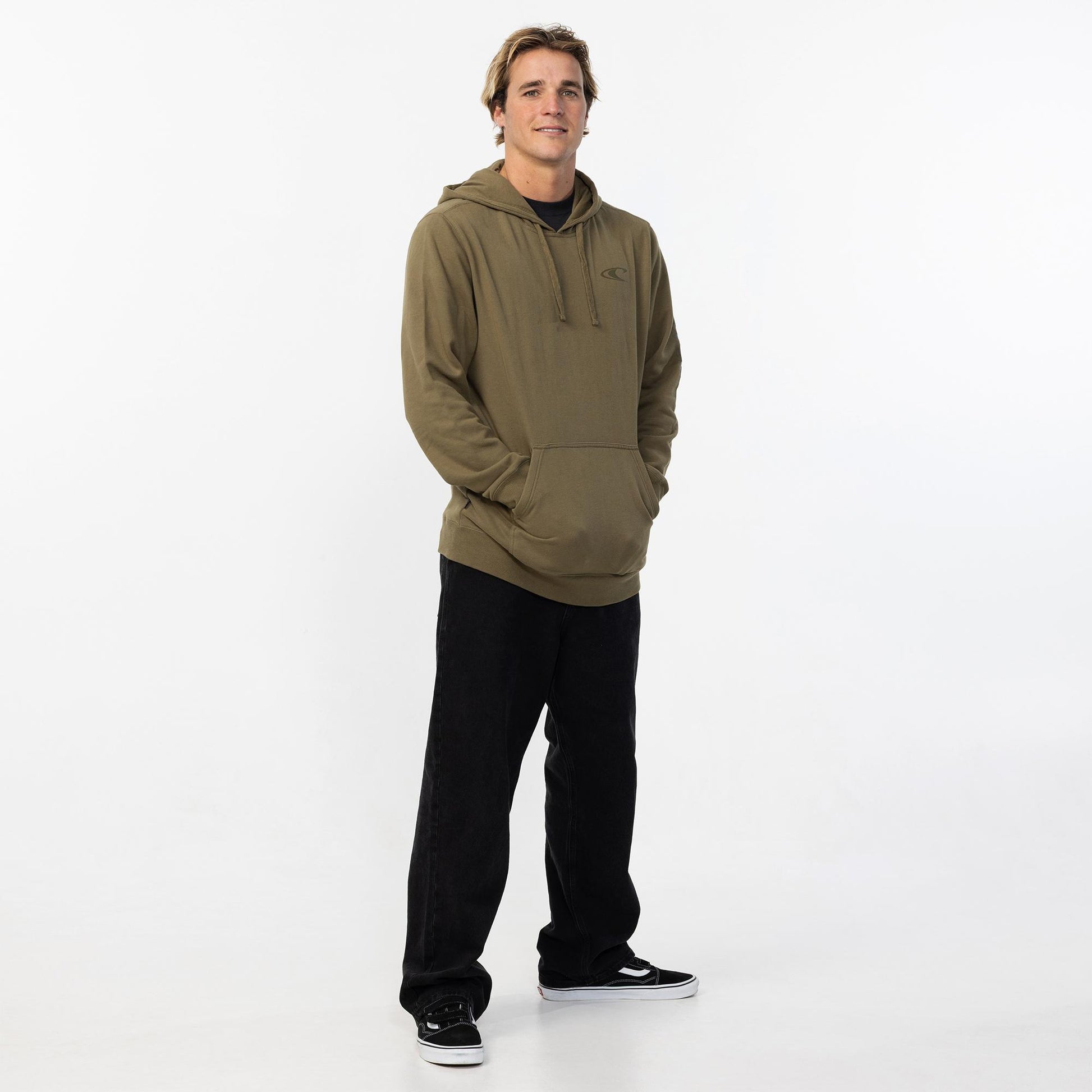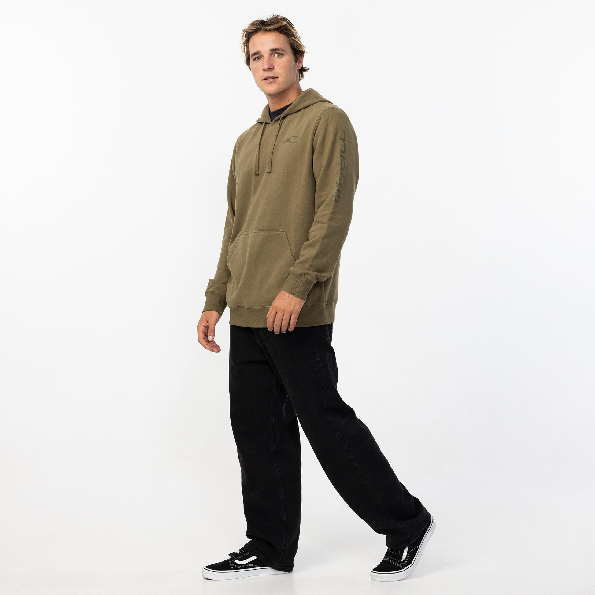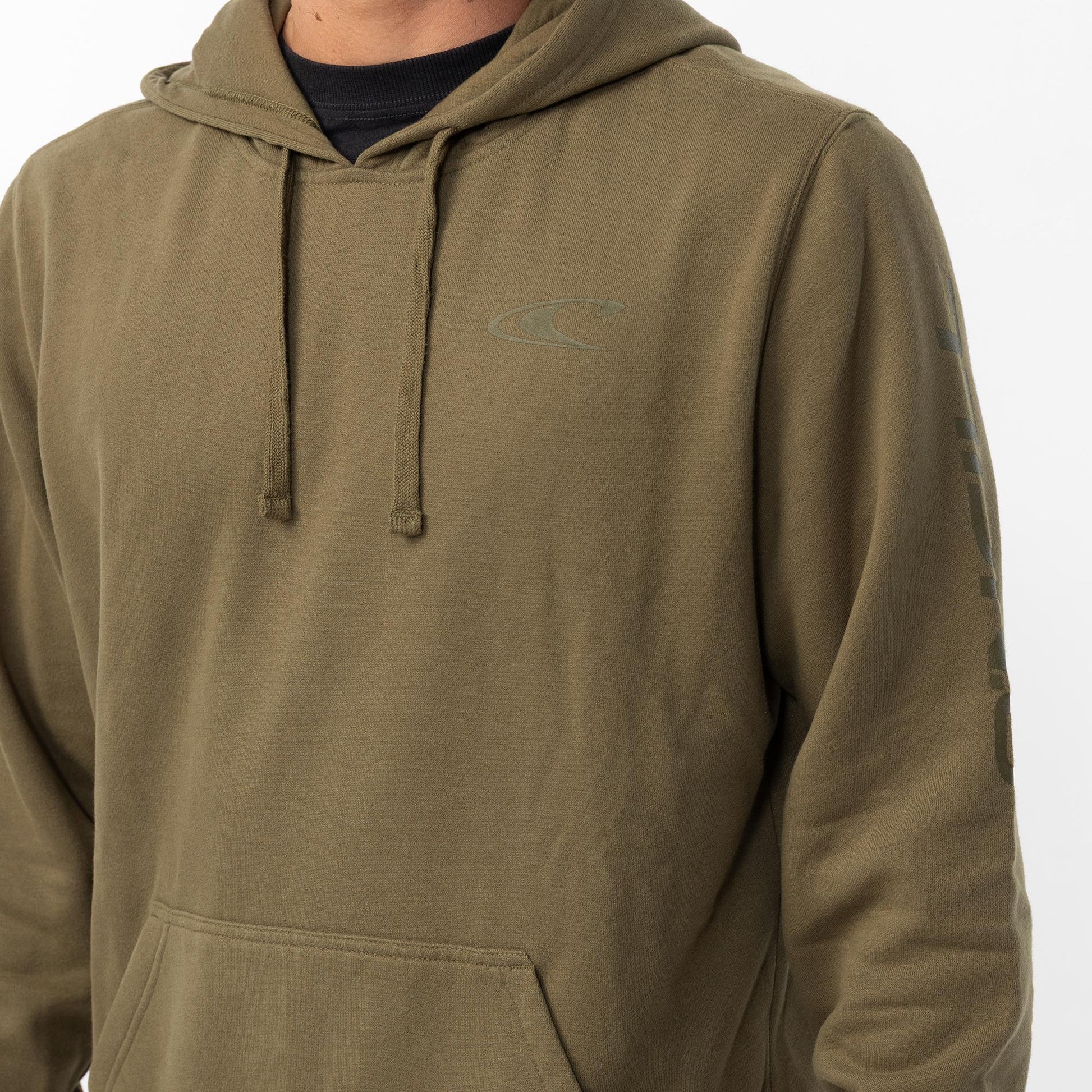 O'Neill Men's hoodie standard fi with relaxed through the body and sleeves. Chest and sleeve screen logo kangeroo pock