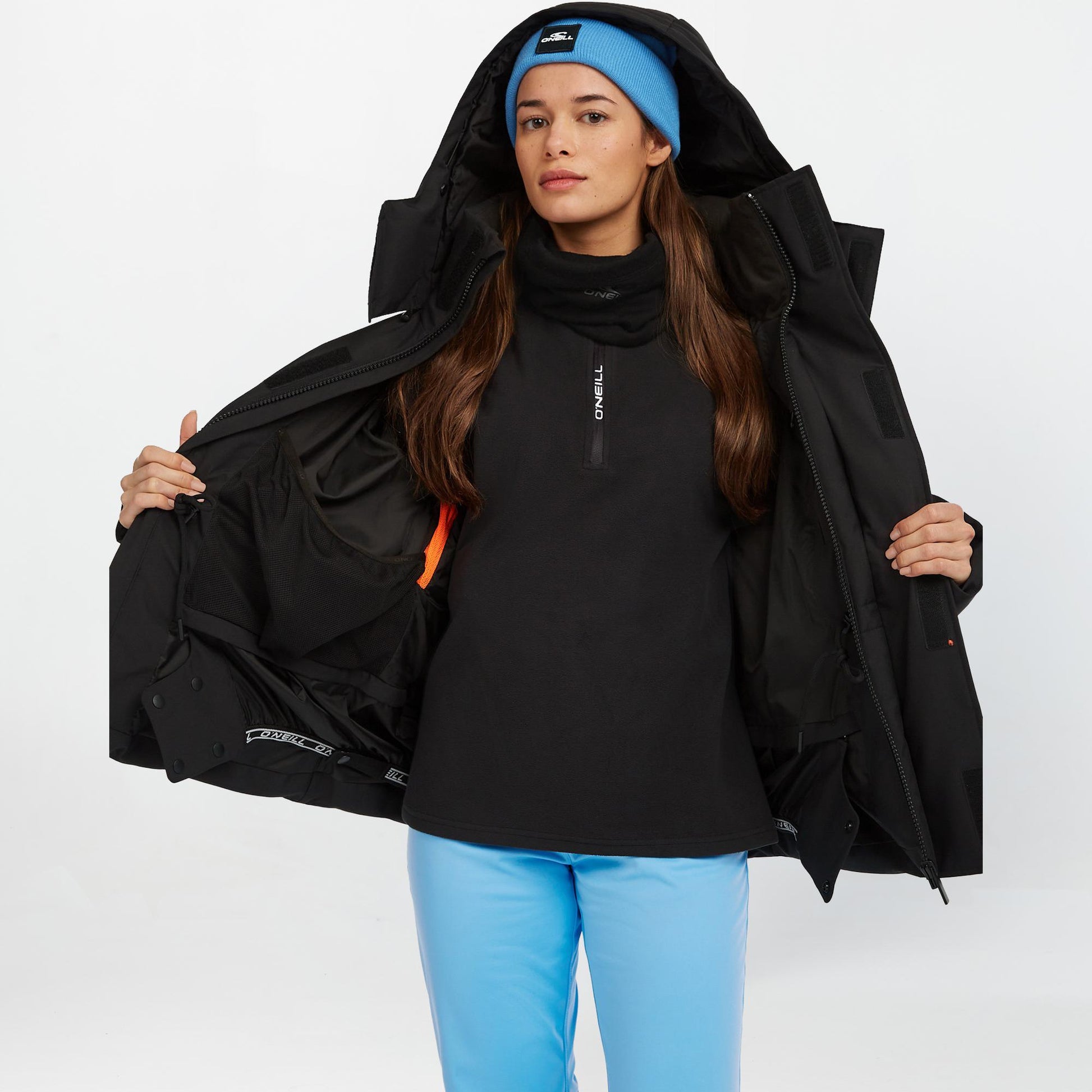 - Liftpass Pocket, Goggle Pocket, Secure Zip Hand Pockets, Flap Chest Pockets with Velcro, Flap Hand Pockets with Velcro,